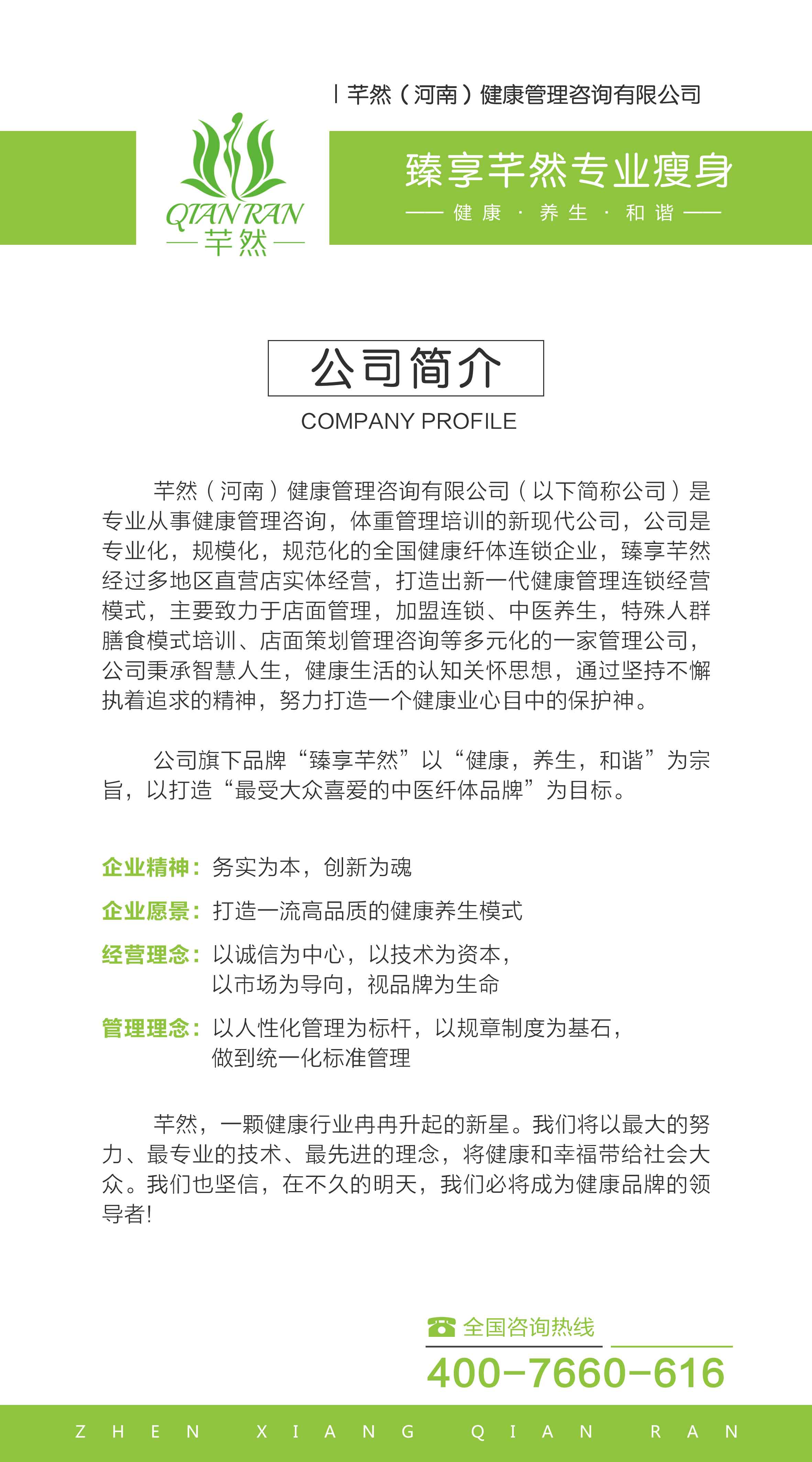 公司旗下品牌“臻享芊然”以“健康,養生,和諧”爲宗旨,以打造“最受大衆喜愛的中醫纖體品牌”爲目标。